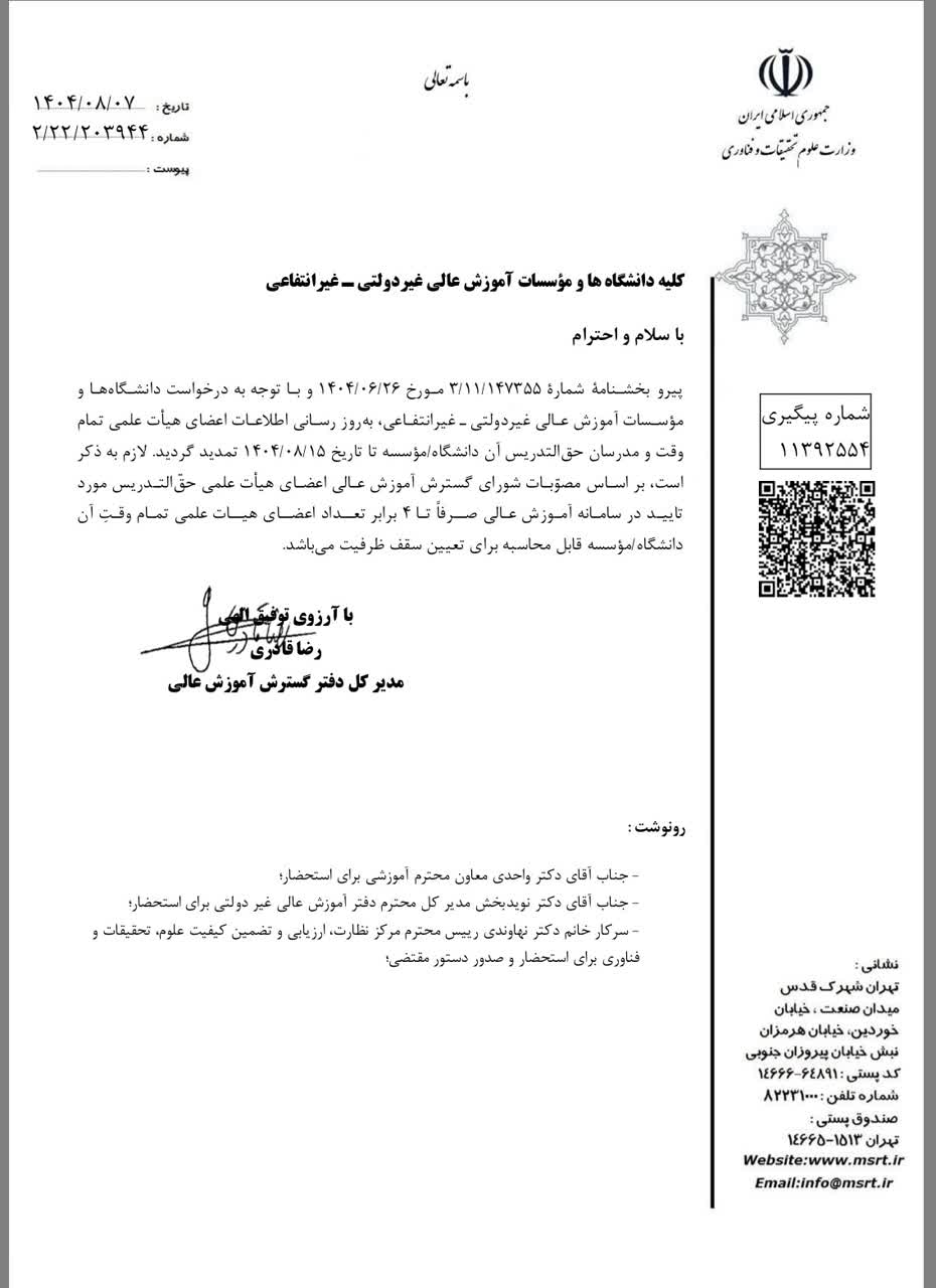 به روز رسانی اطلاعات اعضای هیات علمی تمام وقت و مدرسان حق التدریس دانشگاههای غیر دولتی-غیر انتفاعی تمدید شد